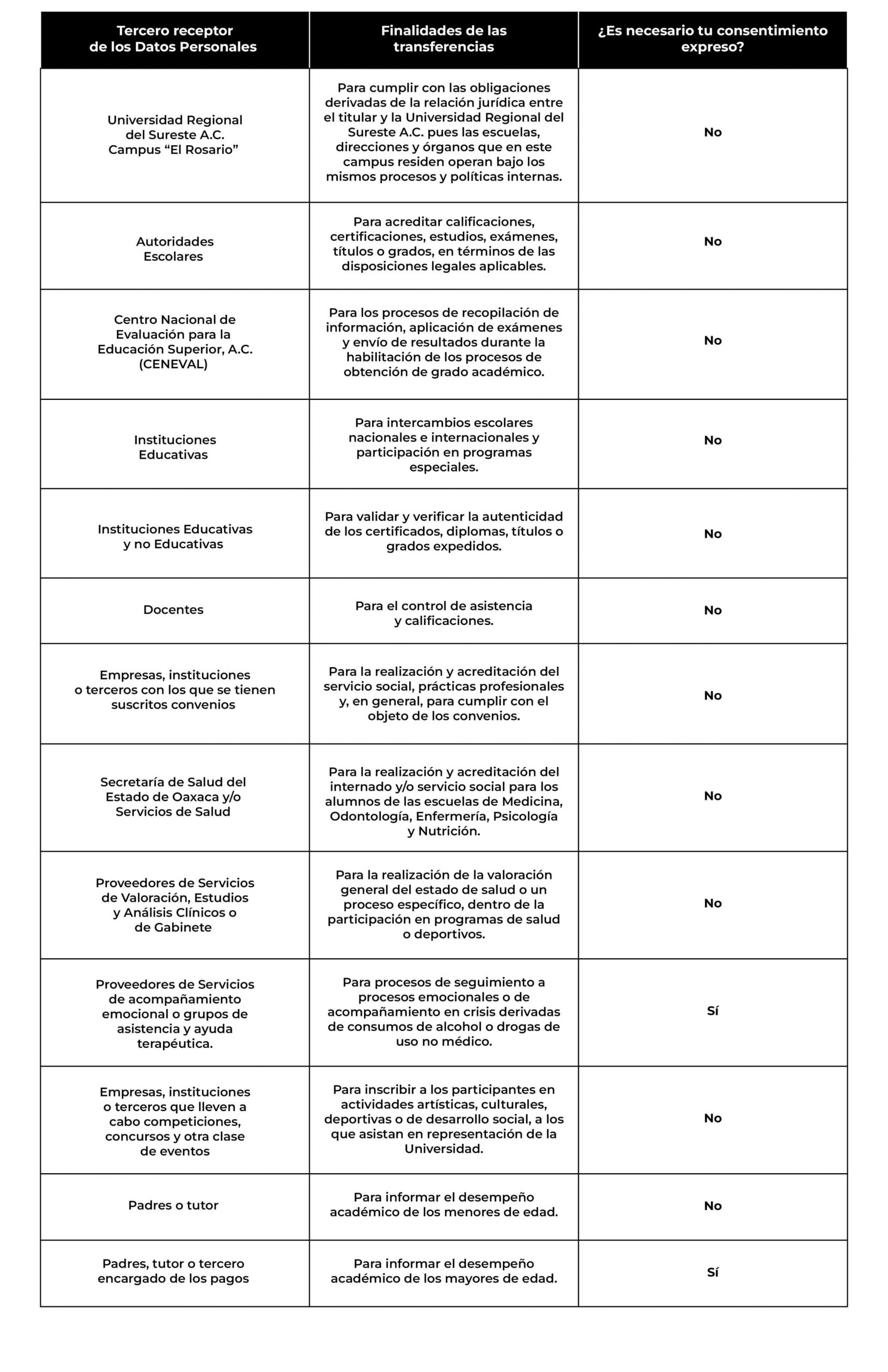 Si no deseas que los datos que nos proporcionas sean utilizados para cualquiera de las finalidades listadas como secundarias, desde este momento puedes hacérnoslo saber mediante el envío de un correo electrónico a la dirección privacidad@urse.edu.mx y en el cuerpo del texto indicar tu nombre, relación con la Universidad (tipo de Usuario) así como tu negativa para la utilización de tus datos en alguna o todas de las finalidades secundarias. Esta negativa no podrá ser un motivo o causa para negar los servicios de la URSE o para dar por terminada la relación establecida con la Universidad.