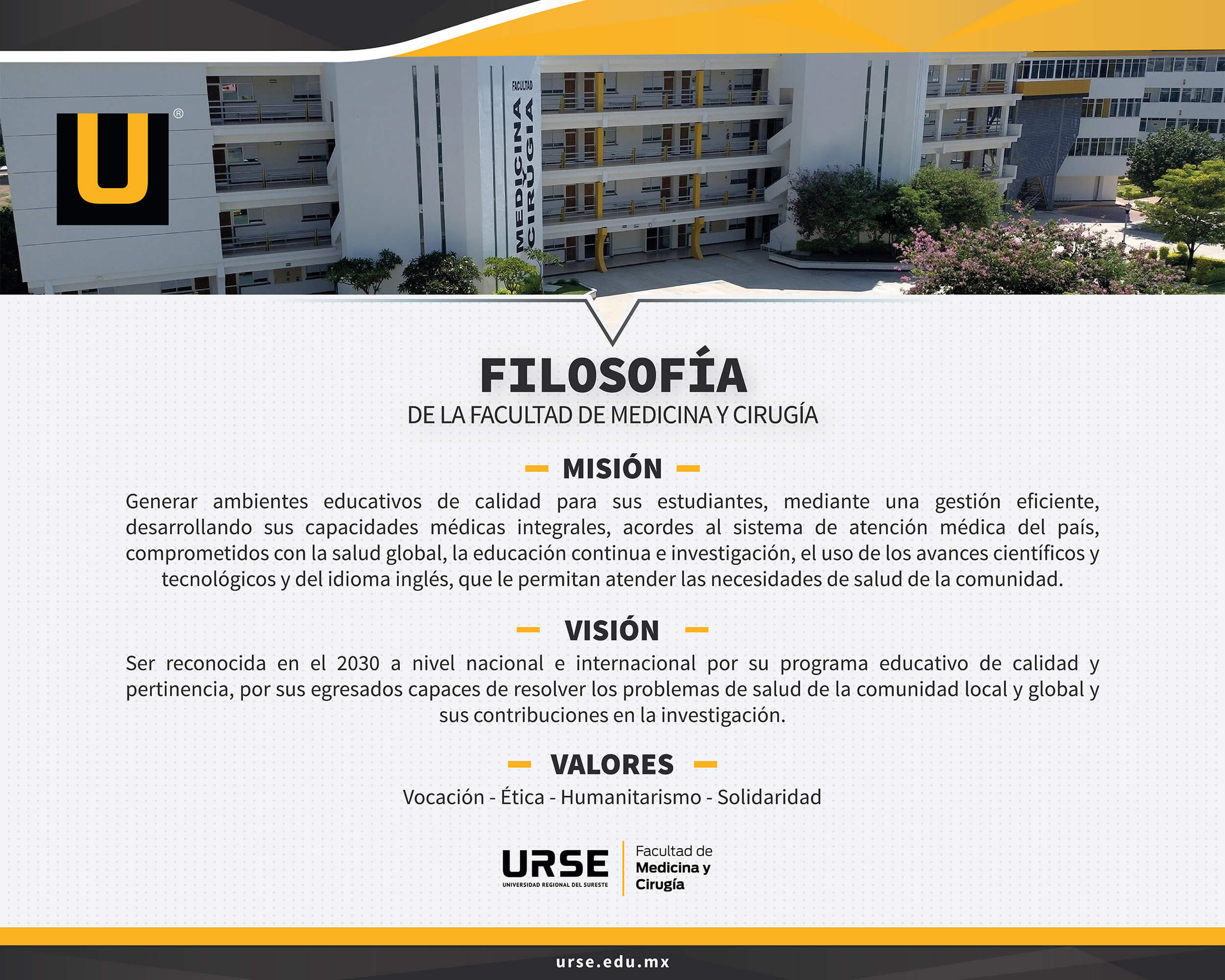 “Generar ambientes educativos de calidad para sus estudiantes, mediante una gestión eficiente, desarrollando sus capacidades médicas integrales, acordes al sistema de atención médica del país, comprometidos con la salud global, la educación continua e investigación, el uso de los avances científicos y tecnológicos y del idioma inglés, que le permitan atender las necesidades de salud de la comunidad”.