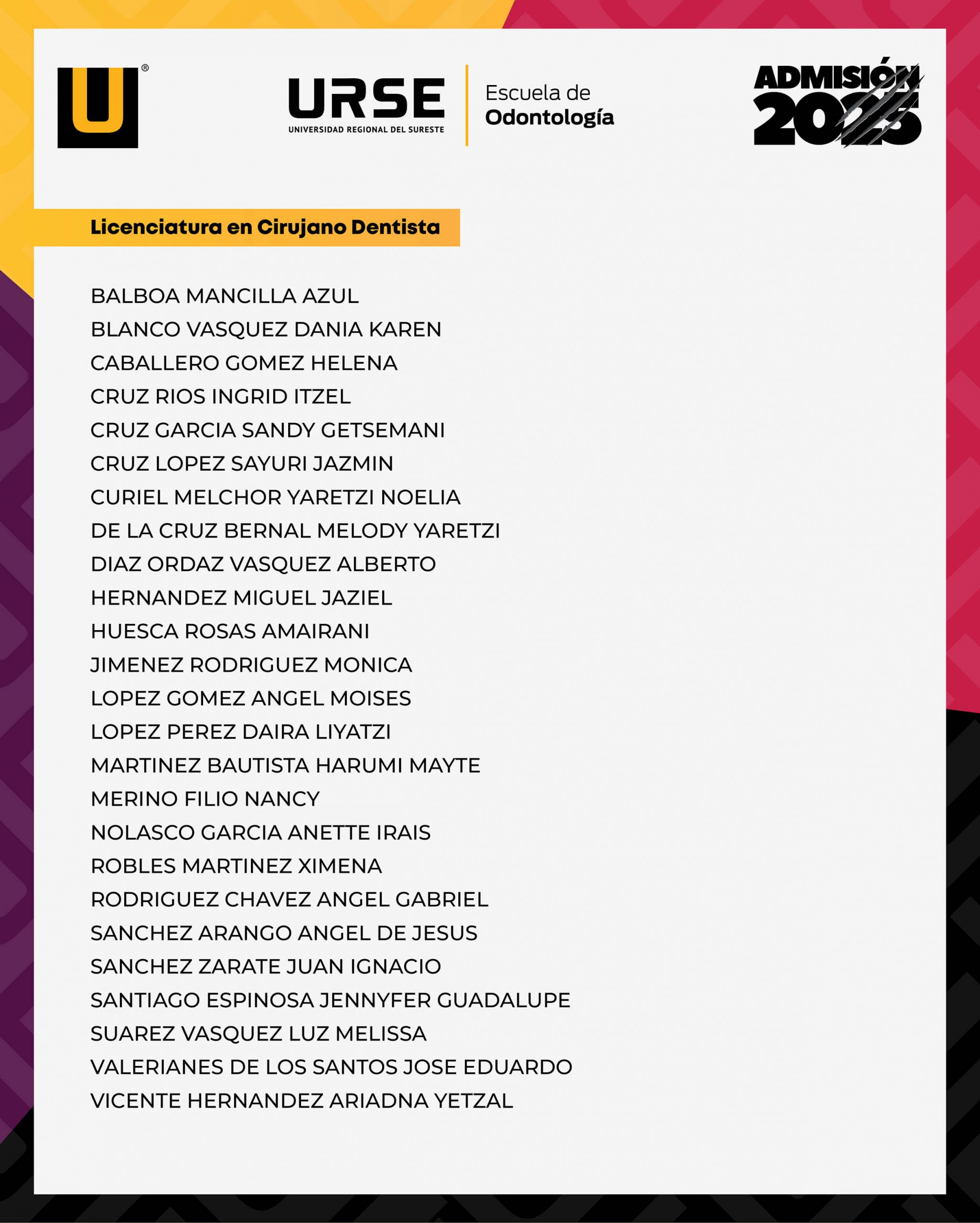 Publicación de Resultados 03 de febrero – Cirujano Dentista LISTA DE ADMISIÓN - 03 DE FEBRERO DE 2025