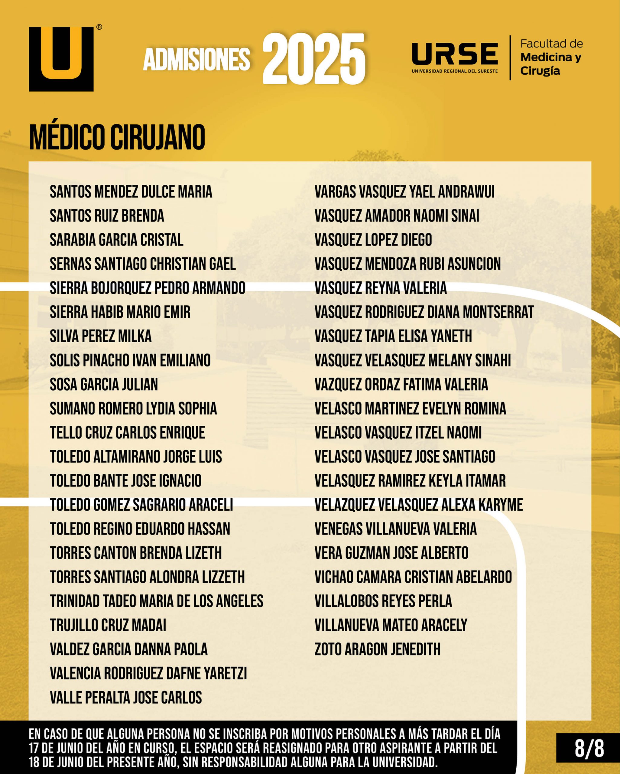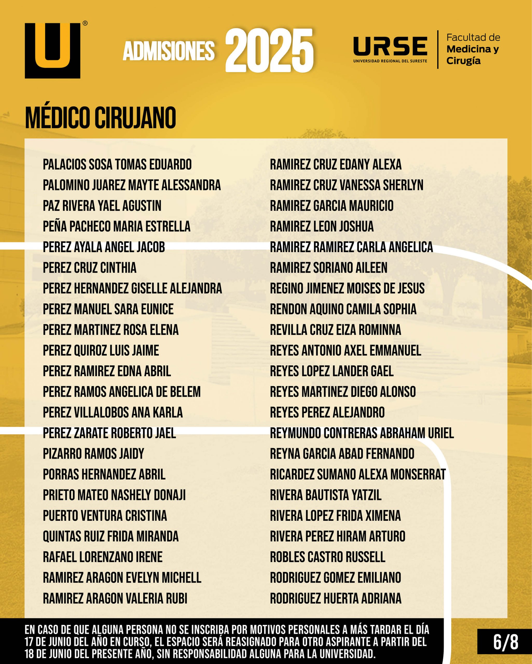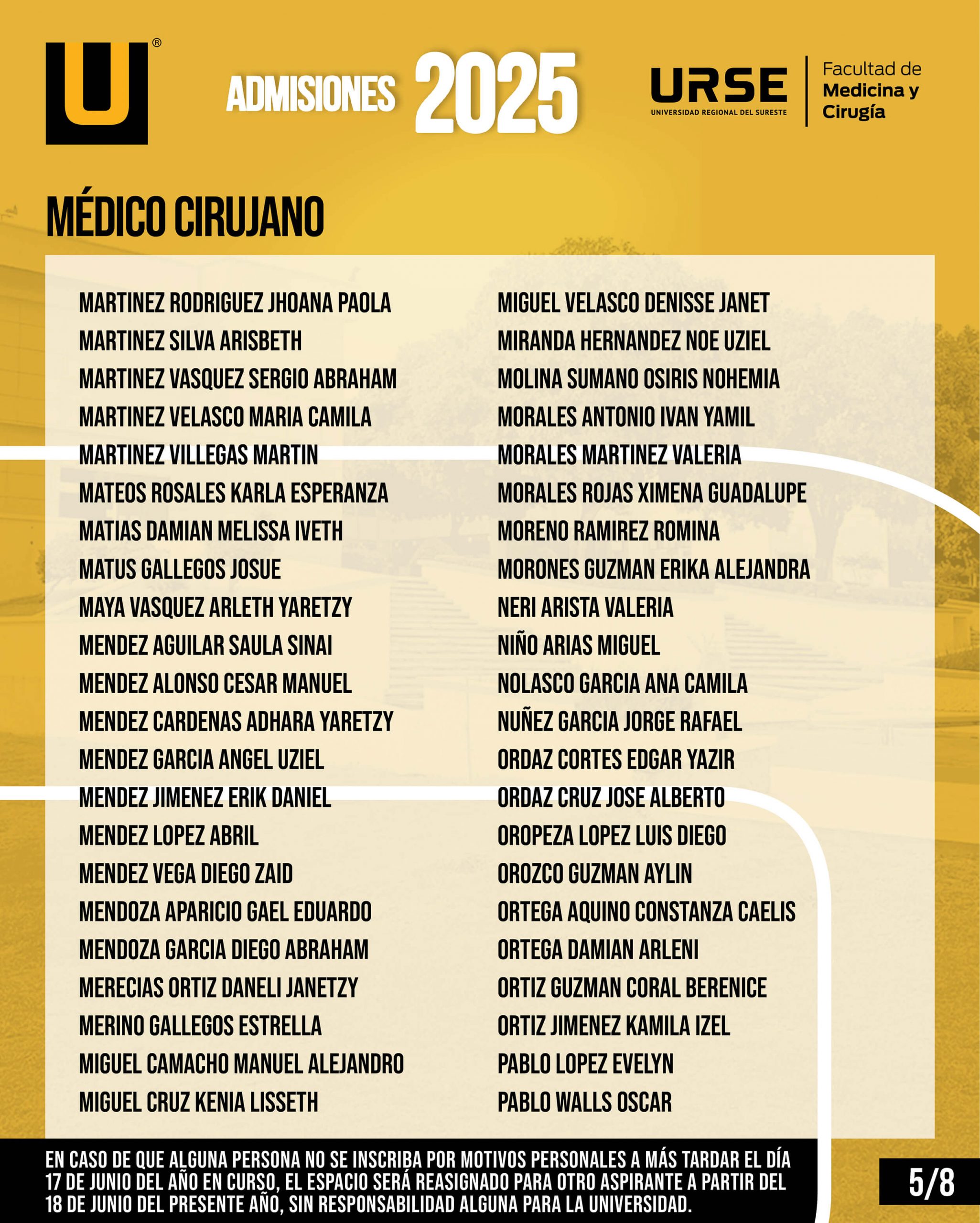 EN CASO DE QUE ALGUNA PERSONA NO SE INSCRIBA POR MOTIVOS PERSONALES A MÁS TARDAR EL DÍA 17 DE JUNIO DEL AÑO EN CURSO, EL ESPACIO SERÁ REASIGNADO PARA OTRO ASPIRANTE A PARTIR DEL 18 DE JUNIO DEL PRESENTE AÑO, SIN RESPONSABILIDAD ALGUNA PARA LA UNIVERSIDAD.