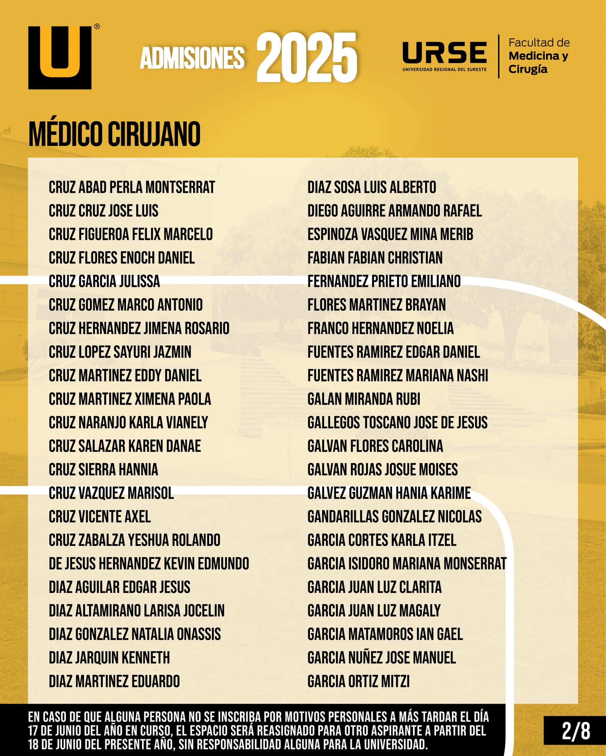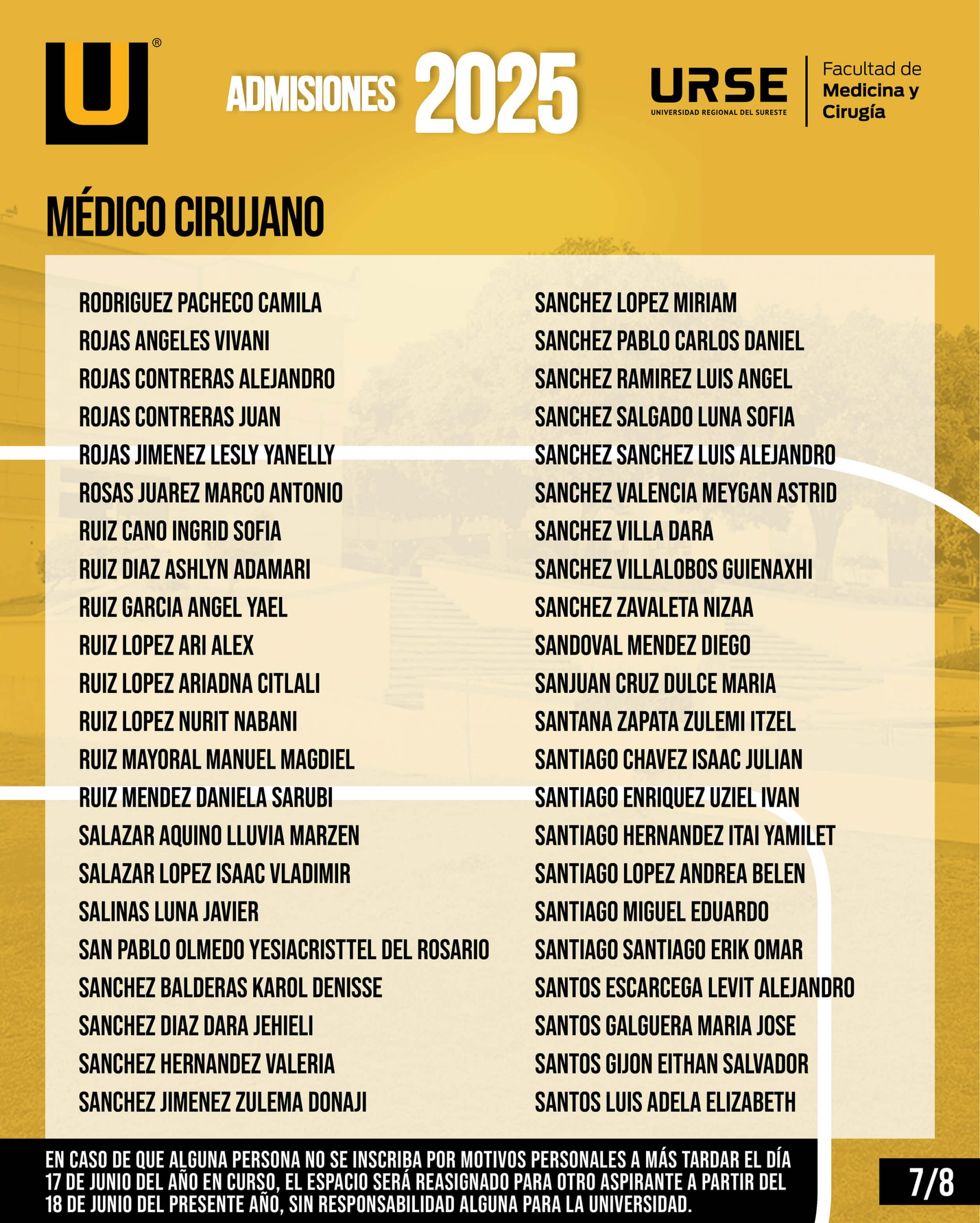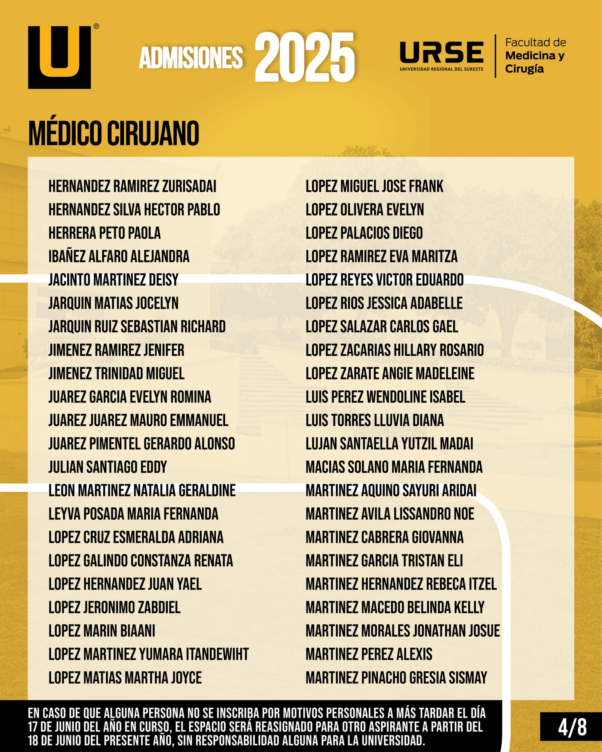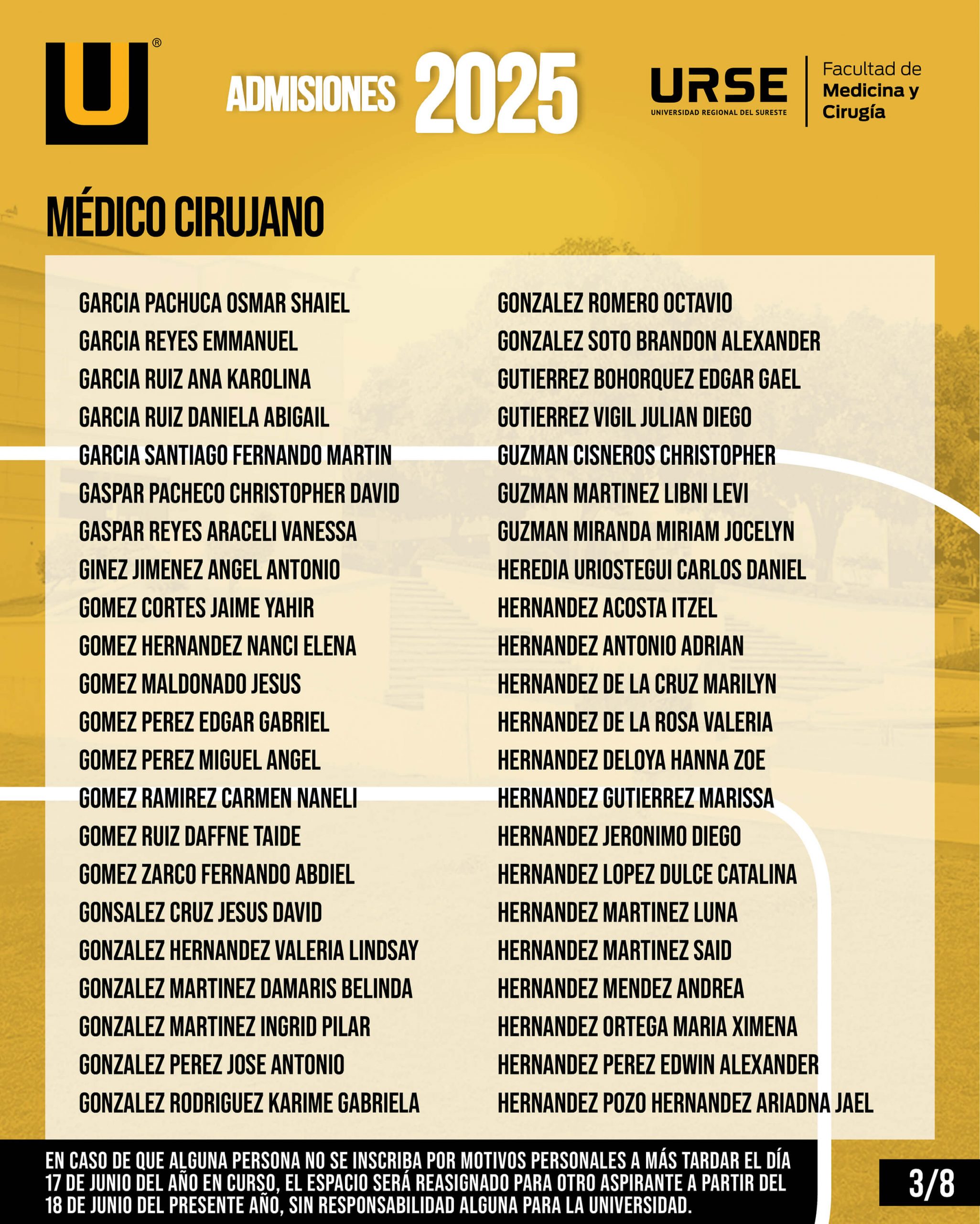 EN CASO DE QUE ALGUNA PERSONA NO SE INSCRIBA POR MOTIVOS PERSONALES A MÁS TARDAR EL DÍA 17 DE JUNIO DEL AÑO EN CURSO, EL ESPACIO SERÁ REASIGNADO PARA OTRO ASPIRANTE A PARTIR DEL 18 DE JUNIO DEL PRESENTE AÑO, SIN RESPONSABILIDAD ALGUNA PARA LA UNIVERSIDAD.